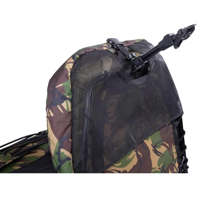 Deze unieke System bedchair van Aqua products is de eerste in zijn soort met DPM camouflage print. Het bed is zo ontworpen dat vrijwel alle wensen van een karpervisser vervult zullen worden, het biedt ultieme mobiliteit en optimaal comfort. Het gewicht van 11kg is zo minimaal dat deze bedchair ook in de kortste sessies met gemak mee te nemen is. Het is een aluminium constructie met 6 poten. Het scharnier is zo gemaakt dat het resulteert in een volledig vlak profiel en compacte transport afmeting. De bedchair is uitgerust met een gepatenteerd pootmechanisme, door op de knop de drukken schuift de poot automatisch naar onderen. De slaapzak is handig te verwijderen met gebruik van klittenbandstroken.