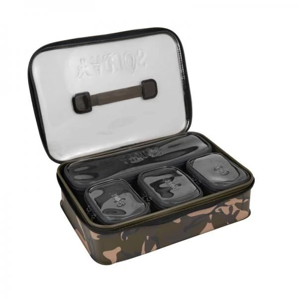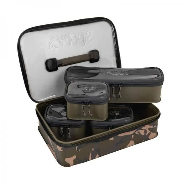 Het Fox Aquos Camolite Accessory Bag systeem is een duurzaam, waterdicht EVA bag systeem. Wordt geleverd met 4 khaki accessory bags. 1 lange bag en 3 korte. Het systeem is ideaal te gebruiken voor het bewaren van end tackle, PVA , lood,stickmix etc. Gemaakt van 1mm dikke wanden en 1,5mm dikke heavy duty basis voor extra sterkte en uitgevoerd met hoogwaardige grote ritsen en ergonomische rits pullers. het systeem is voorzien van een doorzichtige gunsmoke deksel met logo.