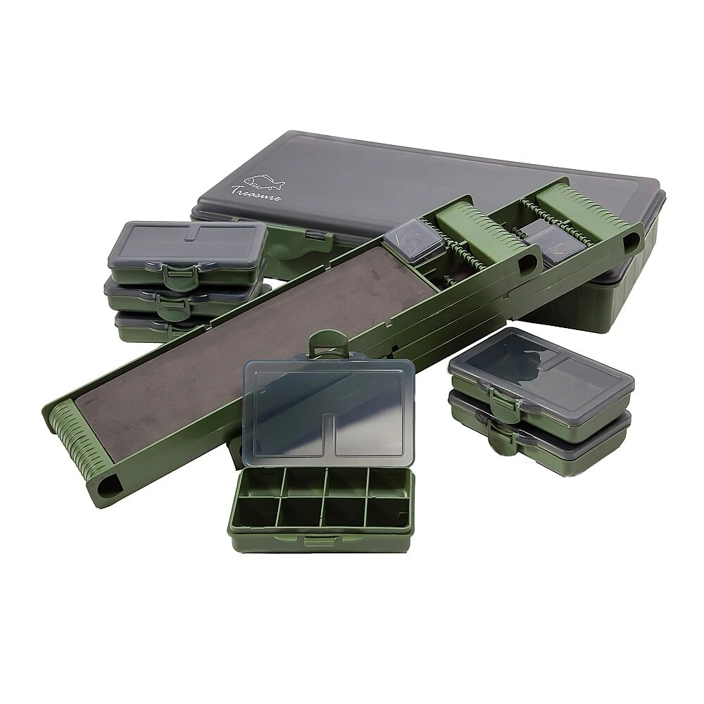 De Treasure Tacklebox is een compleet ingerichte tackle box met veel opberg mogelijkheden. In de box zitten 2 ‘Large’ Foam rigwinders om uw onderlijnen in op te bergen en 6 uitneembare boxen voor het kleinmateriaal of benodigdheden. De kleinere boxen hebben allemaal een verschillende vak indeling van 1 t/m 8 vakken. Bij de Foam winders worden pinnen meegeleverd om de onderlijnen vast te zetten. Afmetingen: 34cm x 19cm x 6cm